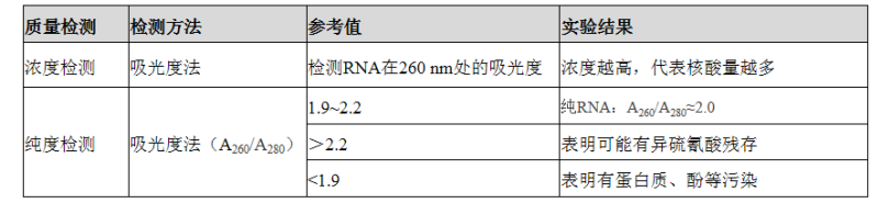 由于RNA具有共軛結構,可以吸收紫外光,故測定RNA溶液在260 nm的吸光度值,可計算出RNA的含量。其中純度高的RNA,A260/A280比值應在1.9~2.2之間,若比值>2.2,表明可能有異硫氰酸,若比值<1.9,表明有蛋白質(zhì)、酚等污染;建議重新提取RNA。