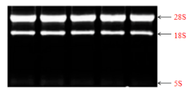 真核生物RNA特有28S、18S、5S三條帶,進(jìn)行瓊脂糖凝膠電泳分析時(shí),28S條帶的亮度大概是18S條帶的兩倍或者以上,且無(wú)拖尾,說(shuō)明RNA的完整性高、未被其他雜質(zhì)污染。若出現其他條帶、或者條帶彌散拖尾,建議重新提取RNA。