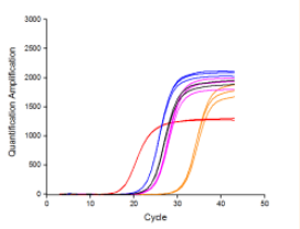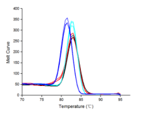 圖7:以1?μg不同物種的RNA為模板(紅色:人肝癌細胞;藍色:雞;黑色:斑馬魚(yú);紫色:水稻種子;黃色:番茄果),用BiomarkerScript Ⅱ 1st Strand cDNA Synthesis Kit進(jìn)行逆轉錄,得到cDNA產(chǎn)物。再以100 ng不同物種的?cDNA為模板,用Biomarker?2×SYBR Green Fast qPCR Mix進(jìn)行qPCR擴增。