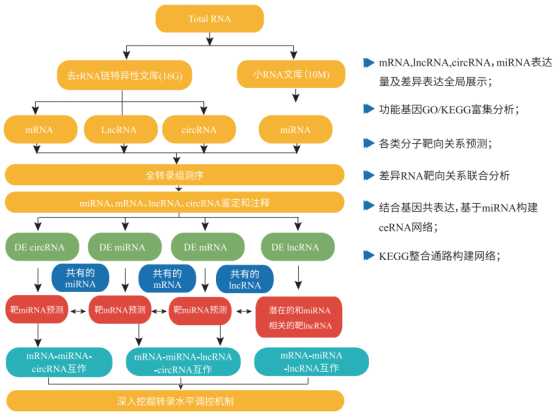 百邁客全轉錄組測序服務(wù)是一次檢測,獲得四種分子(mRNA、lncRNA、circRNA、miRNA)信息,針對不同類(lèi)型的RNA進(jìn)行表達分析,結構研究以及全新轉錄本的發(fā)現,并結合競爭性?xún)仍碦NA(ceRNA)機制,進(jìn)行聯(lián)合分析,深入挖掘轉錄水平調控網(wǎng)絡(luò ),深度探究各類(lèi)RNA分子的調控機制。分析內容如下:
