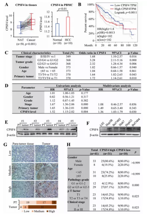 由于CPSF4表達在HCC中顯著(zhù)增加,并且其高水平表達對應于HCC中OS的最高風(fēng)險,因此本研究將重點(diǎn)放在CPSF4上。通過(guò)比較50對配對的序列數據,發(fā)現HCC腫瘤組織中CPSF4表達水平顯著(zhù)高于正常鄰近組織。來(lái)自GSE49515的微陣列數據還表明,10名HCC患者的外周血單核細胞(PBMC)樣本中的CPSF4水平顯著(zhù)高于10名健康對照,這表明CPSF4可以作為HCC診斷的生物標志物(圖 1A)。Kaplan-Meier對364例患者的生存分析顯示,5 年生存率從 CPSF4低表達患者的57%±5%下降到CPSF4高表達患者的42%±5%(p < 0.01,圖 1B)。進(jìn)一步的相關(guān)分析表明,CPSF4與臨床TNM分期、病理分級和臨床分期顯著(zhù)相關(guān)(圖 1C)。單變量分析表明HCC患者的OS率與高CPSF4表達之間存在關(guān)聯(lián)(p < 0.01)。多變量Cox回歸分析顯示CPSF4水平(p = 0.03)是OS的獨立預后因素(圖 1D)。