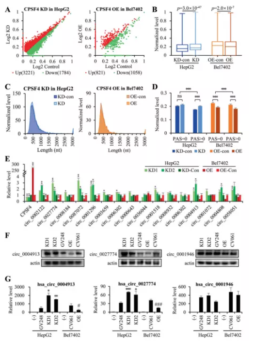 為了驗證,本研究首先從GEO數據庫中選擇了HCC組織中807個(gè)下調的circRNA(FC>2,p<0.05);然后從RNA-seq數據中篩選了1447個(gè)在CPSF4-OE細胞中下調或在CPSF4-KD細胞中上調的circRNA。這兩組數據取交集,共得到24個(gè)circRNA作為驗證的候選circRNA;結構分析表明其中16個(gè)含有PAS序列。實(shí)時(shí)PCR結果顯示,這16個(gè)circRNA中有13個(gè)在CPSF4-OE細胞中被抑制,但在CPSF4-KD細胞中被激活(圖 2E)。選擇2個(gè)帶有PAS元件的circRNA,hsa_circ_0027774 和 hsa_circ_0004913 作為CPSF4靶向的circRNA;同時(shí),另一個(gè)廣泛研究的不含PAS元件的circRNA hsa_circ_0001946作為CPSF4非靶向circRNA。Northern blot結果表明hsa_circ_0027774和hsa_circ_0004913與CPSF4呈負相關(guān),但hsa_circ_0001946在所有細胞系中保持相同水平(圖 2F)。同時(shí)構建了這三種circRNA的OE質(zhì)粒并與CPSF4 OE或KD質(zhì)粒共轉染,real-time PCR結果顯示帶有PAS的circRNA(hsa_circ_0027774和hsa_circ_0004913)與CPSF4水平呈負相關(guān),而不含PAS的circRNA(hsa_circ_0027774和hsa_circ_0004913)不受CPSF4的影響(圖 2G),這說(shuō)明CPSF4在轉錄后抑制了circRNA??傊?,CPSF4直接調節HCC細胞中帶有PAS元件的circRNA的表達。