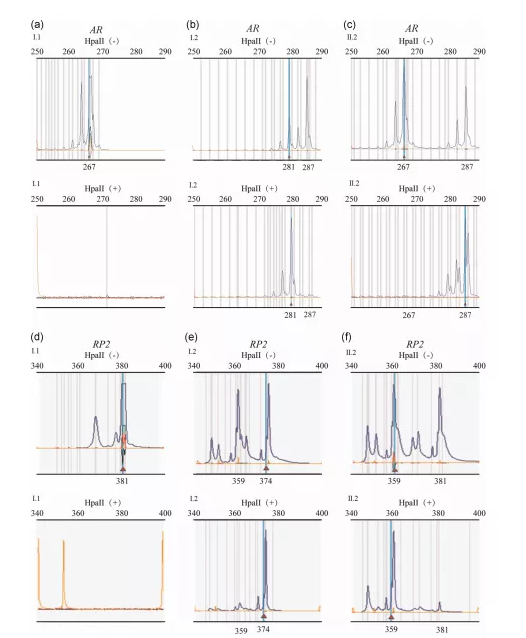 作者進(jìn)行了基于PCR的AR和RP2分析,以評估外周血中的XCI模式。使用甲基化敏感的限制性?xún)惹忻窰paII,使PCR只擴增非活性X染色體上的等位基因。通過(guò)分離分析確定了失活X染色體的起源。