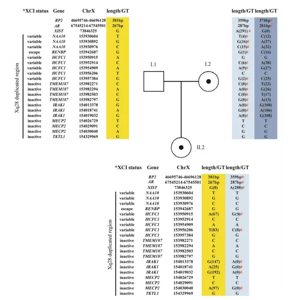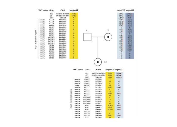 II.2的未消化PCR產(chǎn)物給出了每個(gè)標記的兩個(gè)峰(AR為267/287,RP2為359/381)。HPAII消化產(chǎn)物(圖2c和2f)觀(guān)察到一個(gè)代表287個(gè)AR(359個(gè)RP2)的主峰,這表明失活等位基因遺傳自I.2。對I.2的未消化PCR產(chǎn)物的分析給出了兩個(gè)峰(AR為281/287,RP2為359/374)。通過(guò)分析HpaII消化產(chǎn)物(圖2b和2e)檢測到的主峰(AR為281,RP2為374)與II.2失活產(chǎn)物等位基因中的主峰不同。這些結果表明,在母親II.2和祖母I.2中發(fā)現了XCI的極端傾斜,這與失活X染色體不同(圖2)。AR PCR產(chǎn)物的287 bp峰值、II.2中RP2 PCR產(chǎn)物的359 bp峰值以及Xq28重復來(lái)自祖母I.2,它們與相同的X染色體相連。然而,該等位基因在A(yíng)R PCR后峰值為287 bp,RP2 PCR后峰值為359 bp,Xq28重復,在II.2中失活,但在I.2中激活。
