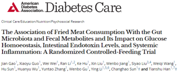 3.Gao J, Guo X, Wei W, et al. The association of fried meat consumption with the gut microbiota and fecal metabolites and its impact on glucose homoeostasis, intestinal endotoxin levels, and systemic inflammation: a randomized controlled-feeding trial[J]. Diabetes Care, 2021, 44(9): 1970-1979.https://doi.org/10.2337/dc21-0099