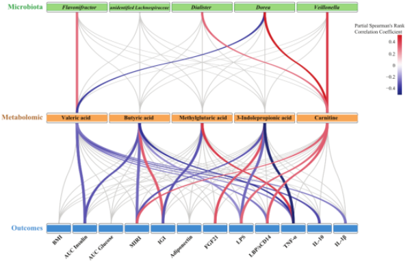 圖3.腸道菌群、共代謝物和葡萄糖穩態(tài)、腸道健康和炎癥的生物標志物之間的相關(guān)性分析。