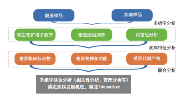 ?微生物組測序(主要指擴增子測序與宏基因組測序)可提供微生物組成、基因功能和豐度信息,而代謝組學(xué)是研究生物體中代謝產(chǎn)物變化的科學(xué)。生物科學(xué)研究過(guò)程復雜,單—組學(xué)往往無(wú)法全面的解決生物學(xué)問(wèn)題,多組學(xué)就顯得尤為重要。近年來(lái),隨著(zhù)微生物組學(xué)研究的不斷發(fā)展和持續火熱,越來(lái)越多的研究者開(kāi)始將微生物組學(xué)和代謝組學(xué)聯(lián)合起來(lái),從物種、基因以及代謝產(chǎn)物等水平共同解釋科學(xué)問(wèn)題,更好地理解疾病過(guò)程及機體內物質(zhì)的代謝途徑,還有助于發(fā)現疾病的生物標記以更進(jìn)—步應用千臨床輔助診斷。