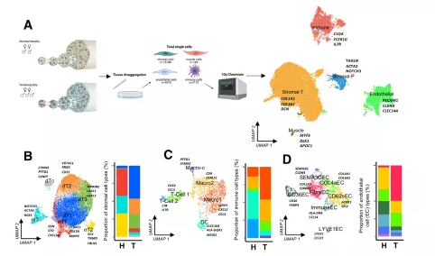 (A) 使用正常(n=4,人腘繩肌腱)和患?。‰觳?,n=5,人岡上肌腱)人肌腱用于單細胞分析。UMAP展示了具有標記基因的內皮細胞、免疫細胞、基質(zhì)肌腱細胞和基質(zhì)壁細胞。(B) 肌腱的基質(zhì)細胞:壁肌腱細胞 (mT)、正常肌腱細胞 1 (nT1)、正常肌腱細胞 2 (nT2)、患病肌腱細胞 1 (dT1)、患病肌腱細胞 2 (dT2)、患病肌腱細胞 3 (dT3) 和患病循環(huán)肌腱細胞 (dTc)。(C) 肌腱的免疫細胞:樹(shù)突狀細胞 (DC)、巨噬細胞 1 (Macro1)、巨噬細胞 2 (Macro2)、循環(huán)巨噬細胞 (Macro-C)、T-Cells1 (T-Cell1) 和 T-Cells2 (T-Cell2)。(D) 肌腱的內皮細胞 (EC):CD36 high EC (CD36EC)、E-Selectin EC (CD62eEC)、膠原 4 血管 EC (COL4aEC)、免疫樣 EC (ImmuneEC)、LYVE1 陽(yáng)性 EC (LYVE1EC) 和 SEMA3G 陽(yáng)性 EC (SEMA3GEC)。