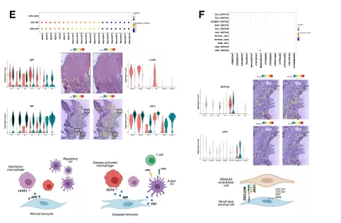 (E) 肌腱中的肌腱細胞-免疫細胞相互作用(n = 3 健康,4 患?。?。來(lái)自健康(粉紅色)和患?。ňG色)肌腱的肌腱基質(zhì)細胞中APP和MIF表達的小提琴圖。正常人肌腱中基質(zhì)APP和巨噬細胞LYVE1 的空間表達可視化,和患者肌腱中的基質(zhì)MIF和巨噬細胞CD74空間表達可視化,方框突出顯示了共表達區域。在來(lái)自健康(粉紅色)和患?。ňG色)肌腱的免疫細胞中LYVE1和CD74表達 的小提琴圖。Biorender 信息圖總結了肌腱疾病中肌腱細胞-免疫細胞的相互作用。(F) 肌腱中的EC-肌腱細胞相互作用。