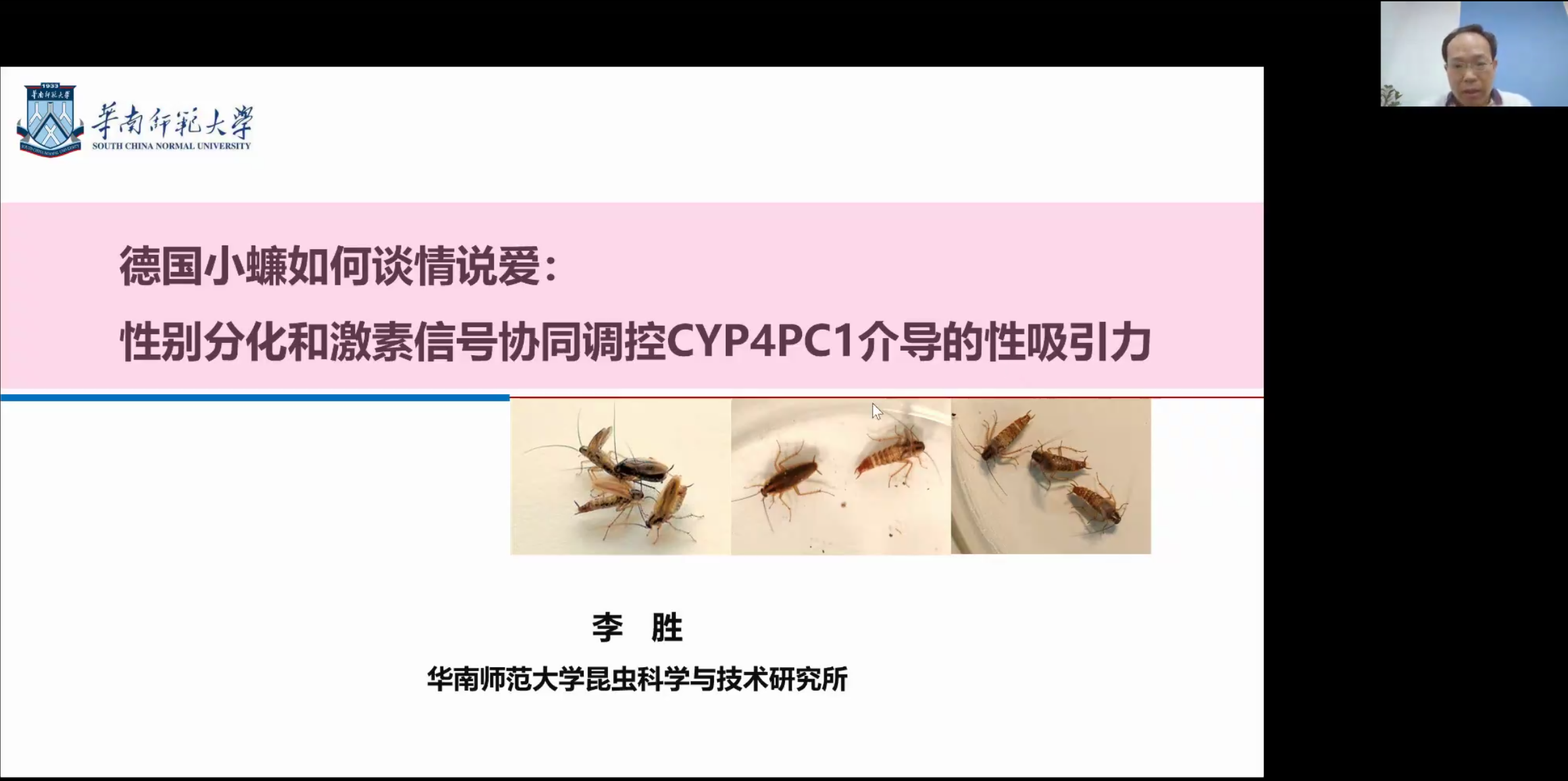 華南師范大學(xué)李勝教授風(fēng)趣的為我們介紹了德國小蠊性激素調控相關(guān)研究。研究團隊通過(guò)轉錄組及相關(guān)驗證實(shí)驗,在觸角中找尋到雄蟲(chóng)中表達量高于雌蟲(chóng)基因的CYP4PC1基因,該基因可能是控制信息素合成的關(guān)鍵基因。通過(guò)基因敲除的方式進(jìn)一步從表型中驗證了CYP4PC1在信息素的產(chǎn)生和求偶的過(guò)程中具有重要的作用。后續研究表明,性別分化基因控制性二型CYP4PC1表達與調控,性別分化和激素信號協(xié)同調控CYP4PC1性吸引力,并使得小蠊成熟時(shí)只有一種性別具有性吸引力。最后李教授表明,通過(guò)性別分化和激素信號協(xié)同調控性吸引力可能在昆蟲(chóng)和哺乳動(dòng)物中普遍存在。
