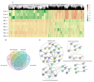 為了探討針刺治療心肌梗死的機制,作者利用納米孔完成了不同組的基因表達檢測。RNA-seq結果顯示,與對照組相比,MI組有5083個(gè)差異表達基因,PC6組與MI組相比有324個(gè)差異表達基因。通過(guò)聚類(lèi)分析將對照組、MI組和PC6組中上調和下調基因制作熱圖和維恩圖,發(fā)現MI組2773個(gè)差異基因上調,針刺治療下調了其中的65個(gè)差異基因,同時(shí),在MI組的2308個(gè)下調的差異基因中,針刺治療可逆轉19個(gè)差異基因的表達。作者推測這84個(gè)差異基因可能是針刺抗心肌缺血作用的關(guān)鍵靶點(diǎn)?;赟TRING數據庫對MI和PC6共同調控的差異基因進(jìn)行蛋白-蛋白相互作用(PPI)網(wǎng)絡(luò )分析。結果表明,蛋白質(zhì)主要富集了4類(lèi),主要包括:炎癥反應,肌動(dòng)蛋白細胞骨架的調節,I型干擾素介導的信號通路,以及RNA聚合酶II基因DNA在核外周的轉錄依賴(lài)鏈。