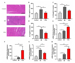 差異基因主要富集在炎癥反應信號通路中,通過(guò)HE染色顯示MI組炎性細胞大量積聚,針刺可明顯減少炎性細胞浸潤。檢測血清中炎性細胞因子的水平顯示MI組血清TNF-α(腫瘤壞死因子-α)、IL-1β(白細胞介素-1β)、IL-6(白細胞介素-6)水平較對照組升高,針刺可降低這些炎性細胞因子水平,并通過(guò)PCR進(jìn)行了驗證。