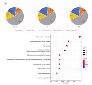 差異AS分析結果顯示,本研究共鑒定出347個(gè)差異AS事件,其中上調174個(gè),下調173個(gè)。AS上調事件數量與AS下調事件數量相同。與對照組相比,MI組有129例AS事件差異上調,147例AS事件差異下調。與MI組相比,PC6組有45個(gè)AS事件差異上調,26個(gè)AS事件差異下調。通過(guò)GO和KEGG富集分析,作者發(fā)現這些基因富集的前10個(gè)通路包括核糖體、HIF-1信號通路、肥厚型心肌病、擴張型心肌病。結果表明,這些參與差異AS事件的基因與心臟病有關(guān)。