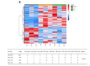 全長(cháng)轉錄組可以準確識別轉錄本結構從而鑒定新轉錄本。本研究中一共鑒定到了602個(gè)新基因。這些新基因大部分為9個(gè)樣本共享,說(shuō)明這些新基因可以在所有樣本中穩定表達。也有一些新的基因僅在MI組和PC6組表達,說(shuō)明在病理條件下這些基因表達模式發(fā)生了變化(圖B)。對照組新基因表達模式與MI組和PC6組差異顯著(zhù);而MI組與PC6組有相似的新基因表達模式。維恩圖分析差異新基因的重疊部分,結果發(fā)現MI組3個(gè)上調基因在針刺后下調,只有1個(gè)下調的新基因通過(guò)針刺表達上調。