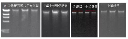 圖1:DNA的凝膠電泳圖。將提取的DNA進(jìn)行1.2%瓊脂糖凝膠電泳跑膠。Lane1:牛血;Lane 2:羊血;Lane 3:松毛蟲(chóng)赤眼蜂;Lane 4:Hela細胞。