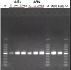 圖5:用百邁客土壤DNA提取試劑盒分別提取不同重量的土壤1(50/100/200 mg)、土壤2(50/100/200 mg)、糞便(100 mg)、扇貝腸道(100 mg)樣本里的DNA。將提取的DNA為模板,VR3為引物,進(jìn)行PCR擴增。然后上樣跑膠,瓊脂糖濃度為1%,70 V電壓,跑膠45 min。