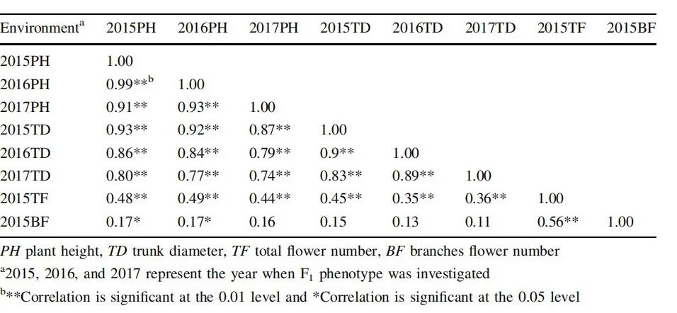 在2015-2017年,對F1群體的4個(gè)表型性狀進(jìn)行了評估,其中,PH是通過(guò)用尺子測量從地面到樹(shù)冠頂部的方式來(lái)調查;TD是記錄移接處上方10cm的直徑;TF和BF是計算總花數和分支花數。此外,相關(guān)性分析顯示,PH和TD呈顯著(zhù)正相關(guān)(r>0.74, p<0.01)。