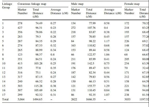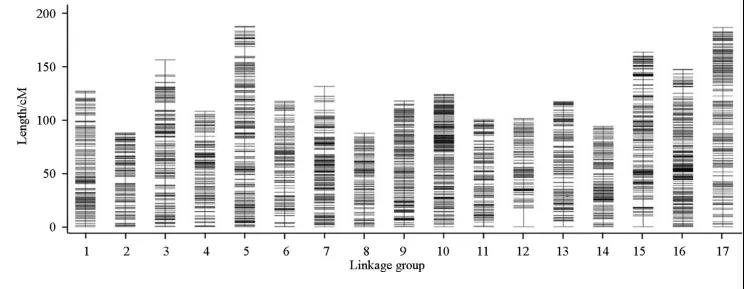 最后,利用HighMap將5113個(gè)高質(zhì)量SLAF標記用于遺傳圖譜構建,其中,雌性圖譜包含2622個(gè)SLAF標記,總圖距1666.35cM。雄性圖譜包含3033個(gè)SLAF標記,總圖距為1197.52cM。中性圖譜包含5064個(gè)SLAF標記,形成17條連鎖群,總圖距為1494.65cM,平均圖距為0.36cM。在該圖譜中,有189個(gè)SLAF標記在11個(gè)連鎖群中存在偏分離,包含112個(gè)SLAF標記的LG7標記偏分離率*高。在LG1、LG2、LG3、LG6、LG12和LG16中均未出現偏分離現象。并對以上圖譜進(jìn)行了單體來(lái)源評估、熱圖評估和共線(xiàn)性評估,結果表明該圖譜是高質(zhì)量的評估遺傳圖譜。