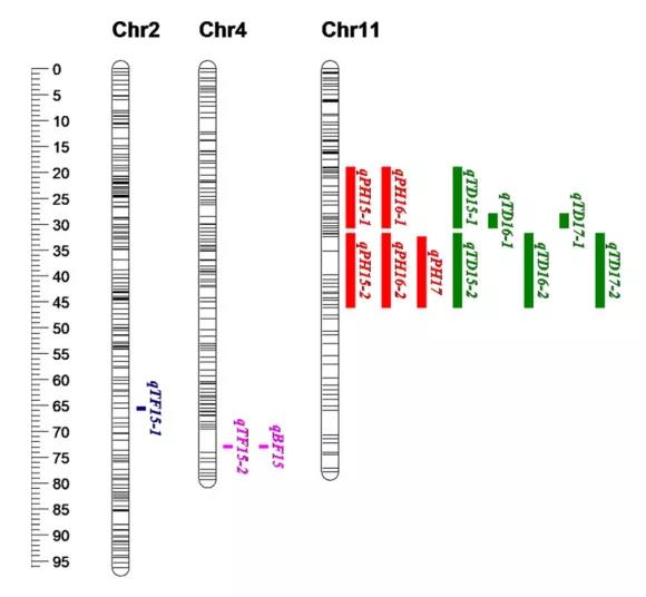 為了檢測F1群體中與4個(gè)性狀相關(guān)的位點(diǎn),對其進(jìn)行QTL分析。對于PH,結合3年的表型,在11號染色體上共鑒定到5個(gè)QTLs(qPH15-1, qPH16-1, qPH15-2, qPH16-2和qPH17),這些QTLs對表型變異的解釋范圍為17.20% ~ 22.40%。對于TD,共定位到6個(gè)QTLs(qTD15-1, qTD16-1, qTD17-1, qTD15-2, qTD16-2和qTD17-2),均位于11號染色體上,對表型變異解釋范圍為14.00~20.80%,PH與TD定位結果相重疊,均位于兩個(gè)QTL簇,該結果進(jìn)一步證實(shí)了PH和TD在表型上呈顯著(zhù)正相關(guān)。對TF,定位到2個(gè)QTLs(qTF15-1和qTF15-2),分別位于2和4號染色體上,解釋表型變異率分別為8.80%和9.20%;另外,還定位到1個(gè)BF相關(guān)的QTL qBF15,可以解釋34.80%的表型變異。qTF15-2和qBF15在4號染色體被定位到同一個(gè)染色體區間內。
