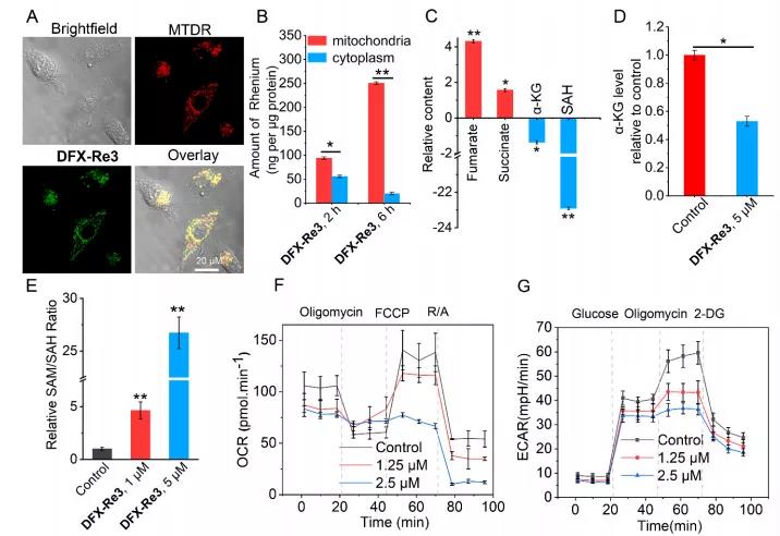 文章設計了三個(gè)線(xiàn)粒體靶向錸(I)配合物,其中加入了一種臨床鐵螯合劑脫鐵石(DFX),以同時(shí)干擾線(xiàn)粒體代謝和鐵穩態(tài)。其中,DFX-Re3可以將細胞鐵遷移到線(xiàn)粒體,干擾線(xiàn)粒體代謝,包括與表觀(guān)遺傳修飾相關(guān)的關(guān)鍵代謝物。