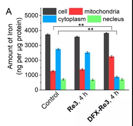 (1)ICP-MS實(shí)驗:DFX-Re3將細胞中鐵轉移到線(xiàn)粒體