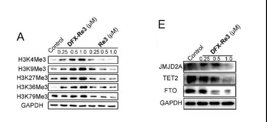 通過(guò)免疫印跡實(shí)驗發(fā)現DFX-Re3處理后抑制甲基化組蛋白H3、JMJD2A、TET2、FTO等甲基化修飾酶的表達。細胞質(zhì)中鐵含量的降低,同時(shí)這些結果表明,鐵在細胞內轉移到線(xiàn)粒體可以增加DNA、RNA和組蛋白甲基化水平。