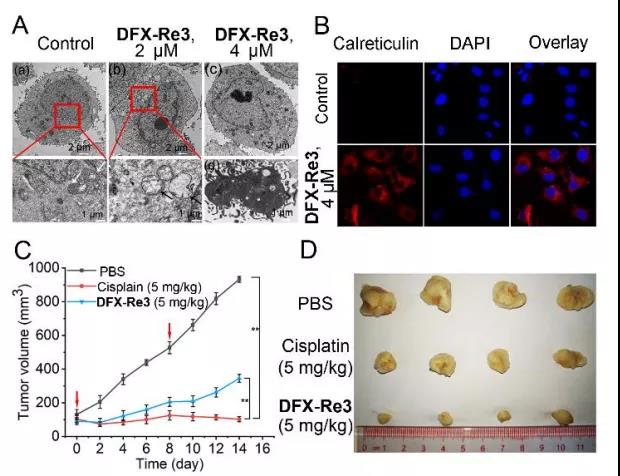 在體內和體外評估了DFX-Re3的抗癌機制。透射電鏡觀(guān)察顯示,DFX-Re3 (2 M, 24 h)處理后線(xiàn)粒體明顯膨脹,提示MMP缺失。濃度較高時(shí),細胞核邊緣和中心出現染色質(zhì)凝聚,細胞核碎裂,提示晚期凋亡。Annexin V/碘化丙啶(PI)雙染色顯示,在DFX-Re3處理的樣品中,凋亡早期和晚期細胞比例呈劑量依賴(lài)性增加(圖S36)。DFX-Re3激活caspase 3/7, Z-VAD-FMK(泛caspase抑制劑)預處理可抑制細胞死亡率。與之前的RNA-seq結果一致,DFX-Re3可以誘導多種免疫相關(guān)基因的表達改變,DFX-Re3誘導免疫相關(guān)基因表達改變。誘導鈣網(wǎng)蛋白調控,這是免疫原性死亡的重要分子標記。這些結果表明,DFX- Re3可誘導caspase依賴(lài)的免疫原性凋亡。體內抗腫瘤實(shí)驗中,DFX-Re3未見(jiàn)小鼠死亡或體重明顯減輕,治療結束時(shí),DFX-Re3未見(jiàn)臟器明顯病理改變。這些數據表明,DFX-Re3在體內具有高的抗癌作用和低的全身毒性。
