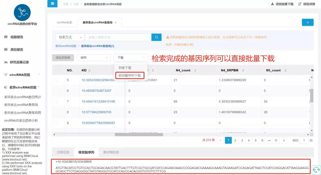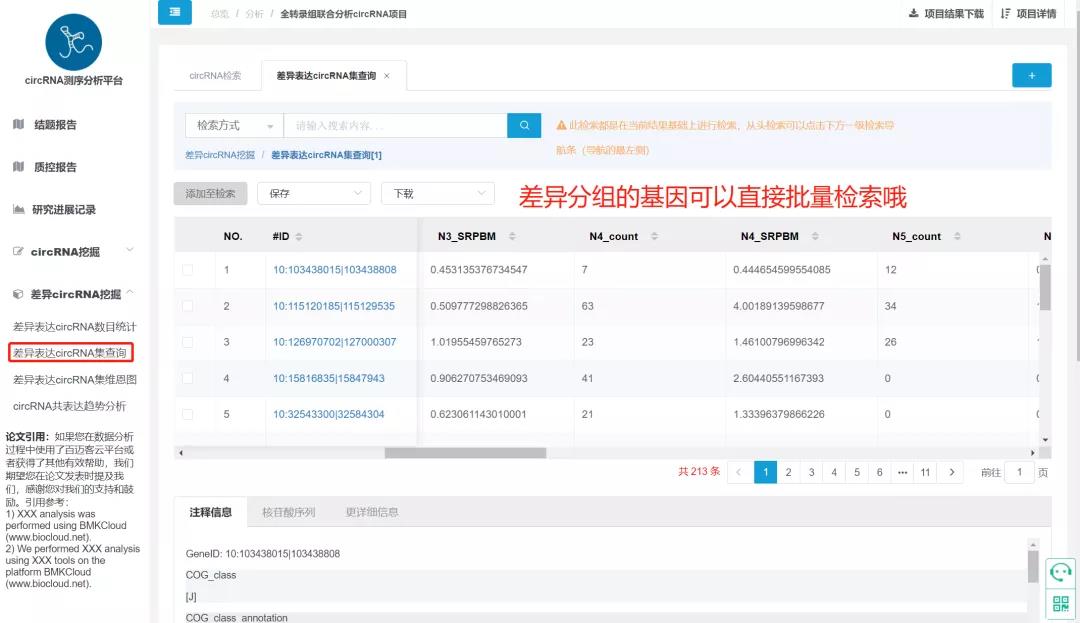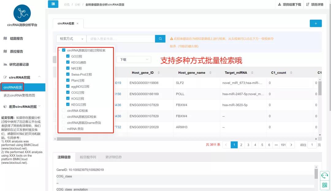 CircRNA的功能分析主要依靠于來(lái)源基因的功能注釋?zhuān)绾卧诤A康臄祿兄苯诱业疥P(guān)心的目的基因呢?首先就是根據功能注釋進(jìn)行檢索,百邁客云平臺的CircRNA分析平臺中,支持針對結果根據八大功能數據庫的注釋信息批量檢索相關(guān)注釋基因、并且批量提取相關(guān)信息;靶向關(guān)系的預測也是關(guān)鍵circRNA檢索的必要一步,CircRNA分析平臺同時(shí)支持通過(guò)miRNA的ID批量提取相關(guān)靶向的CircRNA信息,此外,CircRNA ID、來(lái)源基因ID、來(lái)源基因name等功能,通過(guò)上傳ID文件均可實(shí)現批量查詢(xún),甚至可以批量下載序列文件,省去多個(gè)文件來(lái)回切換的繁雜操作,一鍵式提取關(guān)鍵信息!