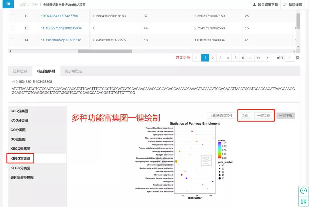 CircRNA的調控作用深度挖掘離不開(kāi)功能富集分析,研究角度的多樣、篩選條件的調整直接導致圖形繪制的重復工作量,為了讓老師們不再為美觀(guān)多樣的富集圖繪制而感到頭禿,CircRNA云平臺支持多種富集圖在線(xiàn)繪制,無(wú)需整理復雜多樣的輸入文件,無(wú)需學(xué)習晦澀難懂的生信語(yǔ)言,無(wú)論怎么調整基因集合,只需要一個(gè)點(diǎn)擊,美觀(guān)準確的八大類(lèi)型富集圖即刻獲得?。ㄅ浜匣蚝Y選功能使用更佳哦~)
