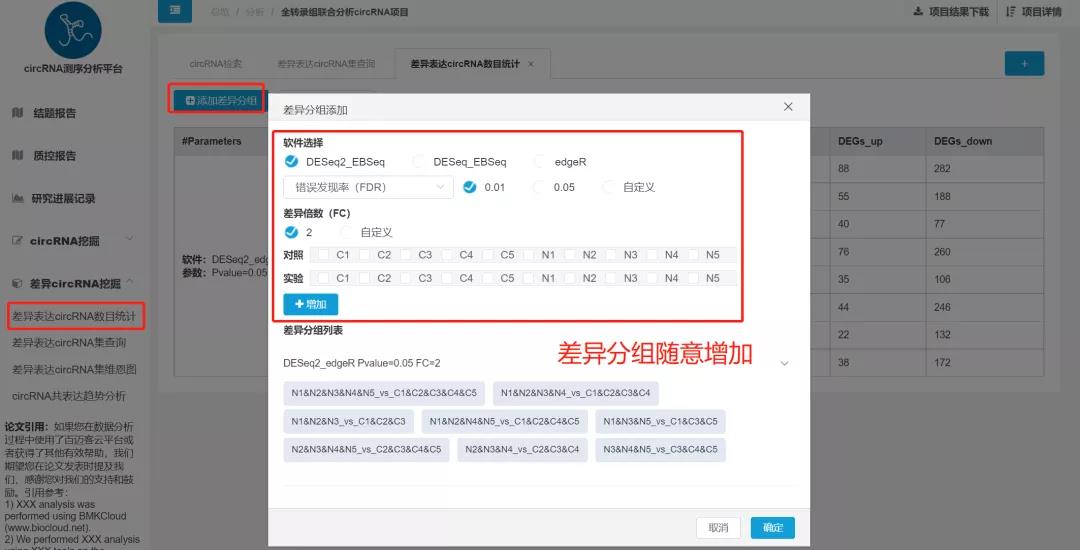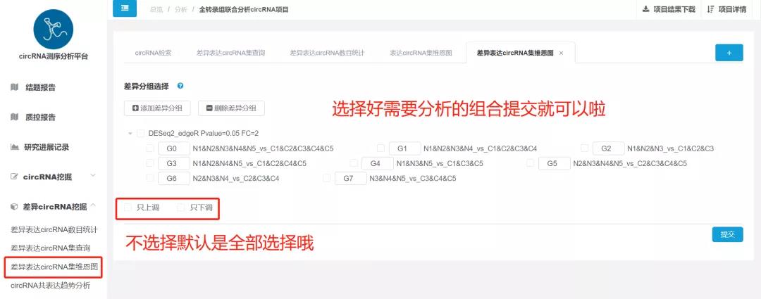 對于需要通過(guò)結果分析挑選關(guān)鍵基因的研究方向來(lái)說(shuō),選擇合適的差異篩選條件對于基因的選擇是事半功倍的,但是往往合適的篩選條件需要多次的調整摸索,這時(shí)差異篩選條件的調整功能顯得尤為重要,CircRNA云平臺同樣支持在線(xiàn)完成差異參數的調整,基因數目太少、差異軟件不合適、參數設置不合理等問(wèn)題,通通可以調整!不限次、不限時(shí),只需簡(jiǎn)單的點(diǎn)擊,輕松完成!