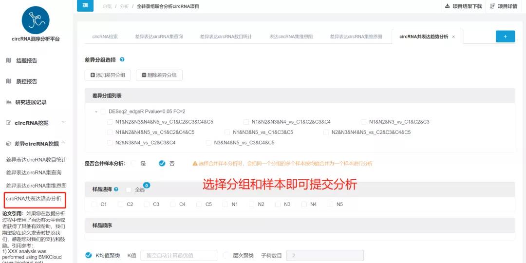 共表達分析常用于識別差異表達基因的共表達模式,分析各樣品間CircRNA表達豐度的不同變化模式,將相同表達趨勢的CircRNA劃分為一個(gè)數據集,通常我們認為,具有相同表達變化趨勢的基因的功能互有關(guān)聯(lián),所以通過(guò)分析CircRNA的共表達趨勢分析,可以進(jìn)一步篩選出項目中關(guān)鍵的基因集合。CircRNA分析平臺搭載了共表達分析個(gè)性化,簡(jiǎn)單的選擇基因集合以及樣本即可完成分析。