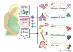 圖1.短鏈脂肪酸(SCFA)對腸道以外的器官和組織的影響,包括發(fā)育中的胎兒。富含不可消化纖維的飲食可促進(jìn)微生物發(fā)酵和結腸中SCFA的產(chǎn)生,從而通過(guò)直接作用于腸道上皮細胞和免疫細胞來(lái)促進(jìn)粘膜動(dòng)態(tài)平衡。[2]