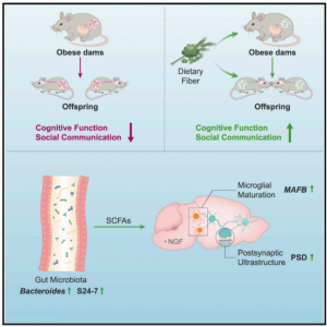 親肥胖與兒童認知和社交能力低下密切相關(guān)。此外,已經(jīng)證明,母親肥胖會(huì )破壞后代的行為和腸道微生物群,母鼠或后代的高纖維飲食通過(guò)減輕突觸損傷和小膠質(zhì)細胞成熟缺陷恢復了這兩種行為和腸道微生物群。共同居住和糞便微生物群移植實(shí)驗揭示了微生物群與行為變化之間的因果關(guān)系。此外,用微生物群衍生的短鏈脂肪酸治療也減輕了肥胖母鼠后代的行為缺陷??傊?,研究表明,微生物群代謝物腦軸可能是母親肥胖引起的認知和社會(huì )功能障礙的基礎,高膳食纖維攝入可能是一種有希望的干預措施。
