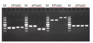 圖3:對不同GC含量(35%~65%)片段進(jìn)行擴增,可實(shí)現高質(zhì)量的擴增。M:250 bp DNA Marker。