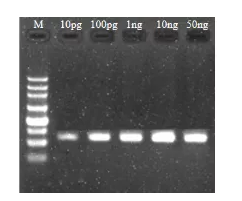 圖4:使用Biomarker HS DNA聚合酶,以不同模板量(10 pg、100 pg、1 ng、10 ng、500 ng)人基因組DNA為模板,擴增 628 bp的目的片段,發(fā)現不同模板量都可有效擴增。M:250 bp DNA Marker。