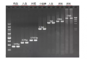 圖2:分別以人、雞、小鼠、昆蟲(chóng)、質(zhì)粒、玉米、水稻、番茄的全基因組DNA為模板,擴增長(cháng)度分別為628 bp、2.5 kb、1750 bp、750 bp、549 bp、300 bp、1.5 kb、1.2 kb的目標片段。M:250 bp DNA Marker。