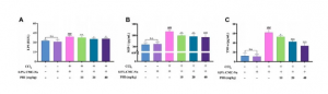 為了評價(jià)PHI的抗炎作用,作者檢測了血清中LPS、MIP-1和TNF-α的水平。如圖5所示,正常對照組與溶劑對照組LPS、MIP-1和TNF-α水平差異不顯著(zhù)。與溶劑對照組相比,CCl4組LPS、MIP-1和TNF-α水平顯著(zhù)升高。20和40mg/kg PHI可顯著(zhù)降低LPS、MIP-1和TNF-α水平。