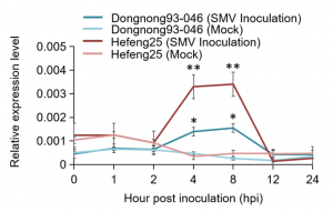 作者進(jìn)一步通過(guò)表達分析、遺傳轉化分析等方法驗證GmST1基因對大豆花葉病毒的抗性,通過(guò)qRT-PCR和RNA-seq對SMV抗性株系Dongnong93-046和SMV-感性株系Hefeng25的不同組織進(jìn)行分析,分析結果表明,GmST1基因受SMV感染調控,且該基因在抗SMV和易感SMV大豆品種之間存在差異表達。通過(guò)轉基因過(guò)表達遺傳轉化實(shí)驗發(fā)現,GmST1的RSVG2-R等位基因提升了大豆對SMV G2和G3菌株的抗性。最終發(fā)現編碼磺基轉移酶的GmST1基因, 賦予大豆對大豆花葉病毒G2和G3株的抗性。