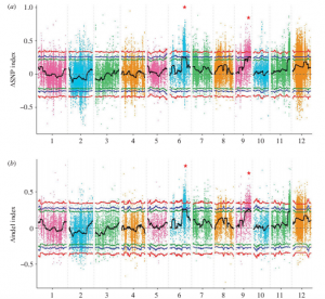 本研究在Longjiang25(耐冷)和Longjiang11(不耐冷)雜交構建的F2群體中(245份材料),挑選50個(gè)耐冷和50個(gè)不耐冷極端材料分別進(jìn)行混池測序,親本各10×,子代分別是67×和80×,進(jìn)行BSA分析;利用SNP index 和indel index方法進(jìn)行性狀與標記的關(guān)聯(lián),最終將候選區域定位到6號染色體和9號染色體上的0.82Mb區域內,分析發(fā)現這些區域共包含98個(gè)注釋基因。