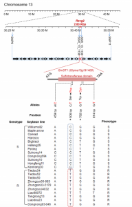 接著(zhù),作者又利用一個(gè)超大F2分離群體,在Rsvg2的間區和側翼區,利用55個(gè)具有多態(tài)性的SSR標記與F2中抗性植株的表型數據進(jìn)行關(guān)聯(lián)分析,將Rsvg2定位至2.83 kb區間內,該區間包含一個(gè)編碼SOT(磺基轉移酶)的GmST1基因。作者將GmST1確定為Rsvg2位點(diǎn)的候選基因。