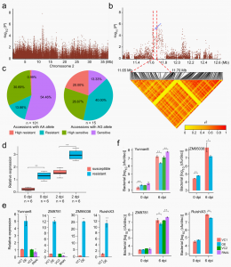 R1周?chē)s合性降低的選擇信號,并且MeTIR1在攜帶GG等位基因的材料中的表達顯著(zhù)高于攜帶CG和CC等位基因的材料(圖4i),說(shuō)明MeTIR1純合變異促使塊根淀粉含量提升。并通過(guò)瞬時(shí)過(guò)表達和沉默技術(shù)進(jìn)一步驗證了MeTIR1在木薯中的功能。進(jìn)一步結合關(guān)聯(lián)分析發(fā)現,對2號染色體攜帶MeAHL17 AA等位基因的材料,經(jīng)選擇馴化促使塊根產(chǎn)量提升的同時(shí)導致木薯細菌性枯萎病抗性丟失。