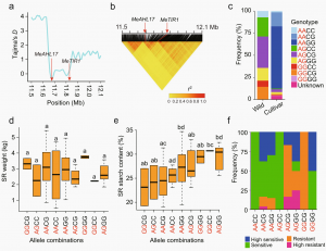 MeAHL17和MeTIR1位于2號染色體上相同的選擇性清除區內。連鎖不平衡分析發(fā)現,兩個(gè)基因緊密連鎖,攜帶AG(MeAHL17)和GG(MeTIR1)等位基因組合的品種顯示出較高的淀粉含量和對木薯細菌性枯萎病的高抗性頻率。