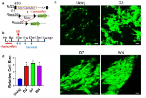 本文采用他莫昔芬對小鼠進(jìn)行處理,并手術(shù)誘導心肌梗死(MI)(圖 1a,b)。未受傷心肌和梗死區的共聚焦成像顯示MI后心臟成纖維細胞數量顯著(zhù)增加,心臟成纖維細胞也變大了(圖1c,d))。