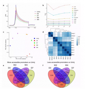 ATAC-seq:新鮮分選的來(lái)自小鼠未受傷心肌和心肌梗死后第3天、第7天、第2周、第4周梗死區的心臟成纖維細胞,每組設置兩個(gè)重復