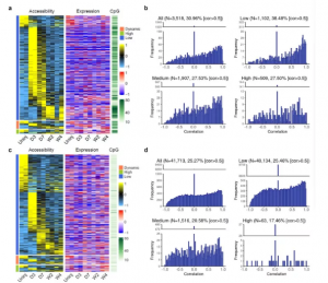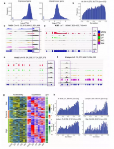 然后根據檢測到的啟動(dòng)子的可及性對它們進(jìn)行分類(lèi):高可及性組,低可及性組和動(dòng)態(tài)可及性組。發(fā)現在三個(gè)組中,很多基因的啟動(dòng)子可及性和轉錄水平有很強的相關(guān)性,但是在高可及性組中有一些基因的啟動(dòng)子可及性和轉錄組水平有著(zhù)較弱的或者無(wú)相關(guān)性。有趣的是,具有高啟動(dòng)子可及性的基因具有最高的CpG密度,而具有低啟動(dòng)子可及性的基因具有最低的CpG密度(圖4g)。當根據啟動(dòng)子中的CpG密度將5,431個(gè)差異表達基因分為3組時(shí),發(fā)現CpG密度較低但具有很強的正相關(guān)性的基因占比最高,進(jìn)一步表明DNA甲基化可以獨立調控基因轉錄,而與啟動(dòng)子染色質(zhì)可及性無(wú)關(guān)(圖4h)。