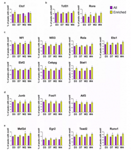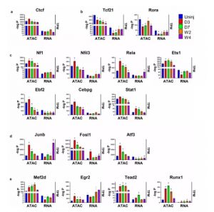 接下來(lái)分析每個(gè)分組中這17個(gè)TF motif在遠端ATAC-seq 峰中的結合位點(diǎn),發(fā)現與未受傷組相比,對應的靶基因在MI后的分組樣本的心臟成纖維細胞中是上調的。分析結果說(shuō)明除了Ctcf,大多數MI后的分組樣本中的TF motif在遠端ATAC-seq峰對應的上調靶基因區域中的富集程度高于所有遠端ATAC-seq峰(圖7a-e)。