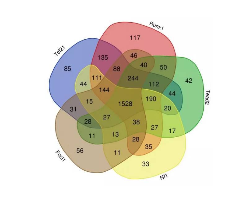 單個(gè)TF靶向的差異表達基因的比較結果揭示在Tcf21、Runx1、Tead2、Nf1 和 Fosl1 之間有著(zhù)最大的交集(圖 8),表明許多與MI后心臟成纖維細胞的激活和分化相關(guān)的基因是受多個(gè)關(guān)鍵TF共同調節的。