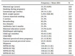 380個(gè)樣本中有364個(gè)成功進(jìn)行了微生物菌群分析(圖1)。在隨后的統計分析中,排除了一名孕齡較晚的受試者、35名WPPSI-III量表測試方法不準確的受試者以及5名運輸/儲存不規范的受試者,共323名受試者。對于其余的家庭,記錄人口統計資料(母親年齡、兒童年齡、性別),產(chǎn)前、產(chǎn)期和產(chǎn)后因素(胎齡、出生體重、吸煙情況、剖腹產(chǎn)、母乳喂養、母親教育、多語(yǔ)言教育、兒童的BMI、抗生素使用情況)以及認知水平(WPSSI-III 總智商(FIQ),言語(yǔ)智商(VIQ)、操作智商(PIQ)和通用語(yǔ)言組合(GLC))(表1)。