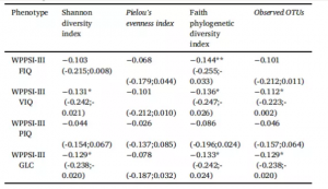 阿爾法多樣性指標與認知水平之間存在顯著(zhù)負相關(guān)。如表3所示,Faith系統發(fā)育多樣性指數與WPPSI-III FIQ之間的顯著(zhù)關(guān)聯(lián)。同時(shí)發(fā)現抗生素的使用與Shannon多樣性指數和Pileou均勻度呈負相關(guān),妊娠期與Shannon多樣性指數和觀(guān)測到的物種數呈負相關(guān),以及C-section與Faith的系統發(fā)育多樣性指數呈現正相關(guān)(圖S1)。