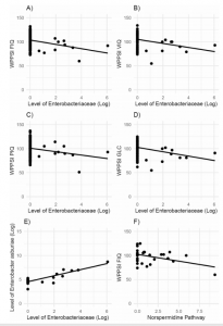 圖2和3表明腸桿菌科的一個(gè)屬(未知屬)的相對豐度與較低的WPPSI-III FIQ顯著(zhù)相關(guān)。這個(gè)屬也和WPPSI-III VIQ,PIQ和GLC的低水平得分相關(guān)(圖2 A-D)。后續分析同時(shí)揭示了另外一個(gè)屬-韋榮球菌科優(yōu)桿菌屬,與WPPSI-III VIQ得分相關(guān)。